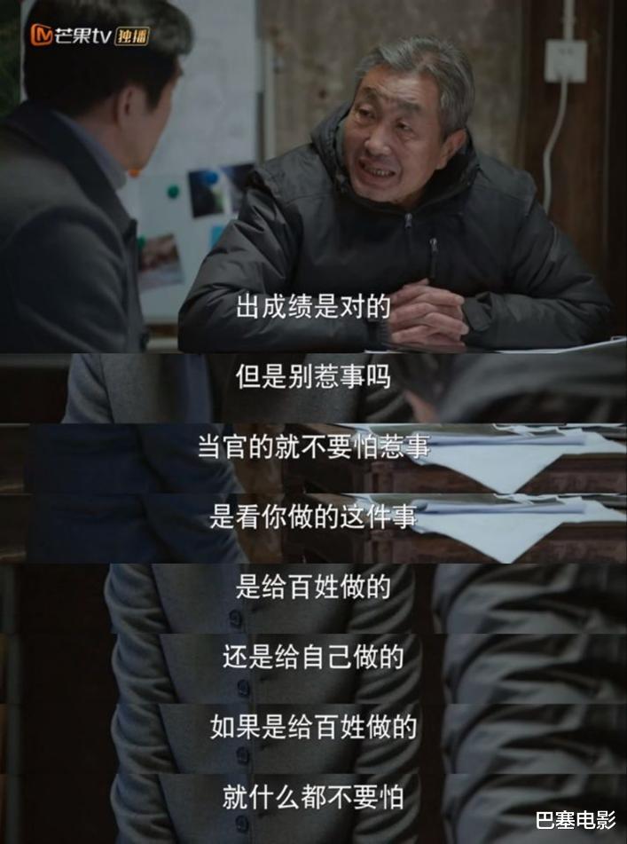 在与郑寒江吃饭时,老组长鼓励郑寒江,只要是为老百姓做事,就不要害怕担责,不要害怕惹事,王宬就用自己的方式支持他、鼓励他。