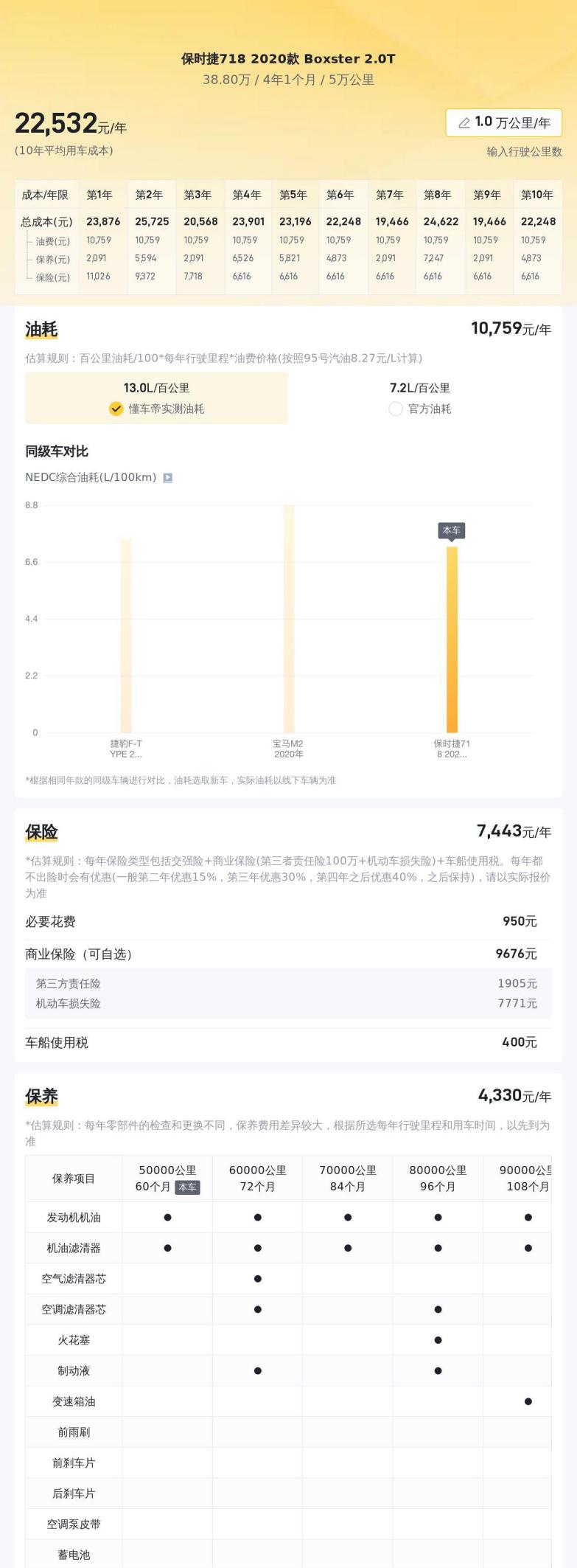 除了购车成本,用车成本也是一个需要考虑的因素。 根据数据显示,保时捷718 2.0T的十年平均用车成本为22677元/年,低于同级别跑车的平均水平。 这也降低了你的用车负担。