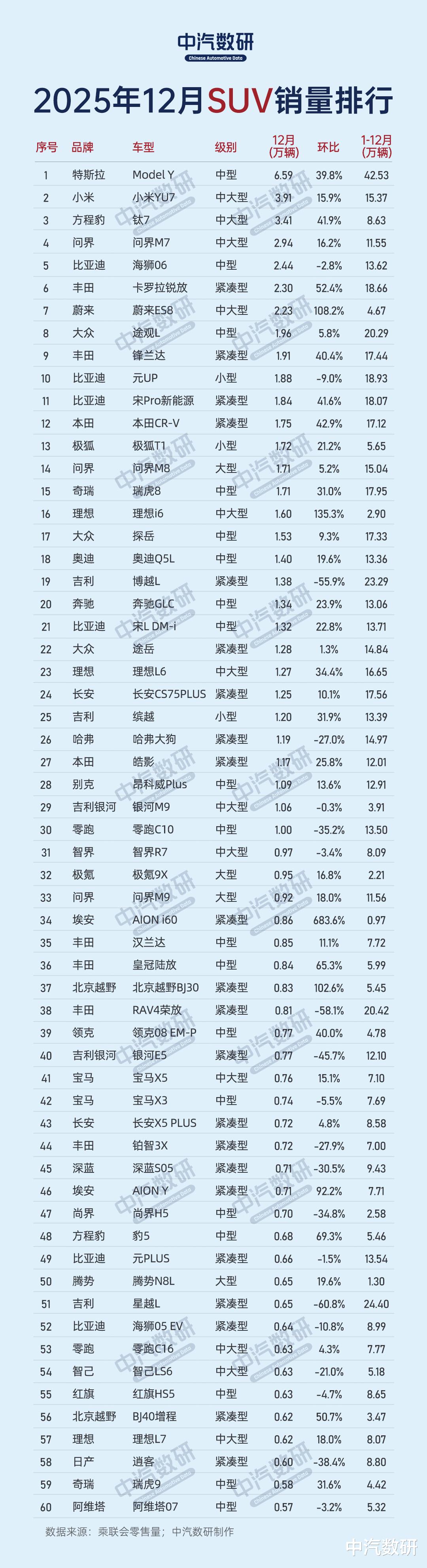 SUV TOP60:Model Y蝉联冠军,新势力抢占中高端区间