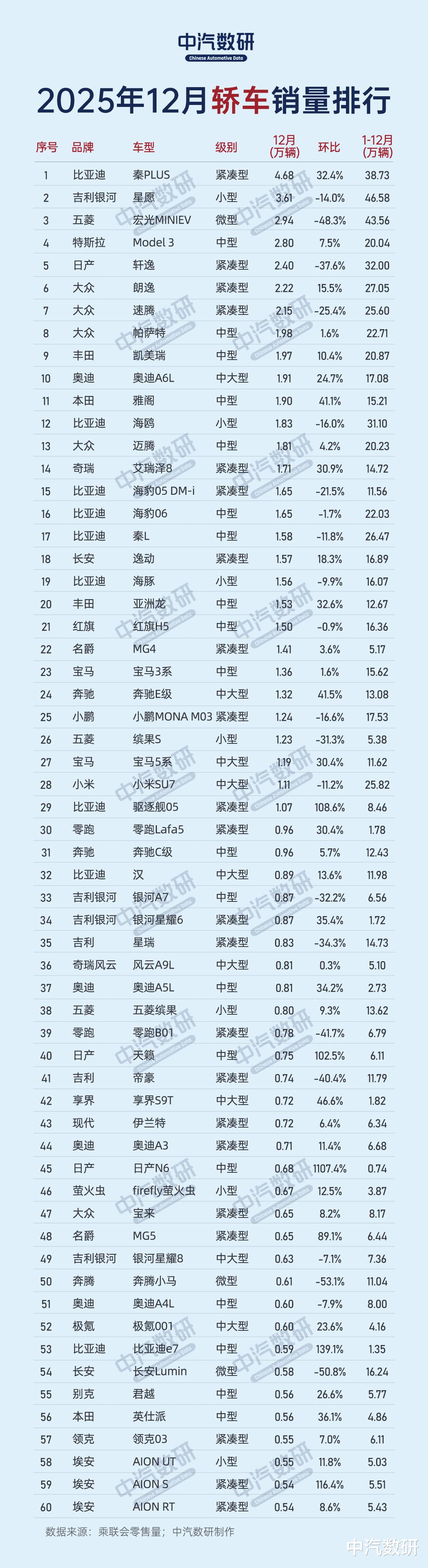 轿车TOP60:比亚迪入9席,新能源包揽前4