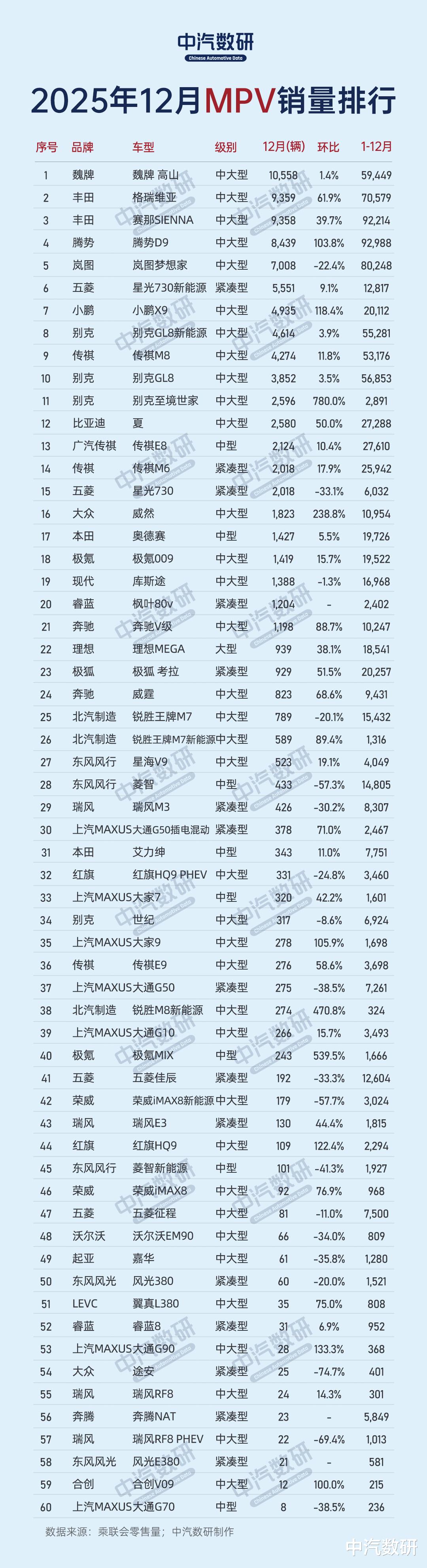 MPV TOP60:中大型新能源成主流,腾势D9增速亮眼