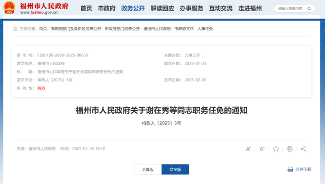 谢在秀同志任福州市人民政府办公厅副主任,免去其福州市软件园管理委员会副主任职务;