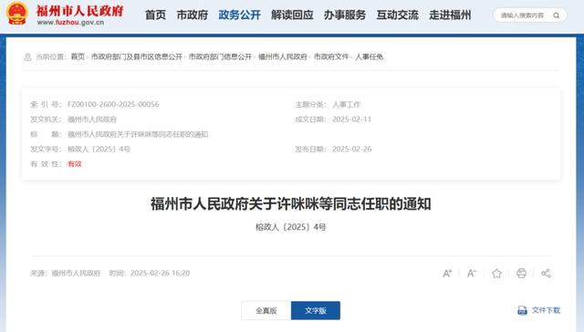 许咪咪同志任福州新区管理委员会产业促进局(新兴产业局)副局长(试用期一年);