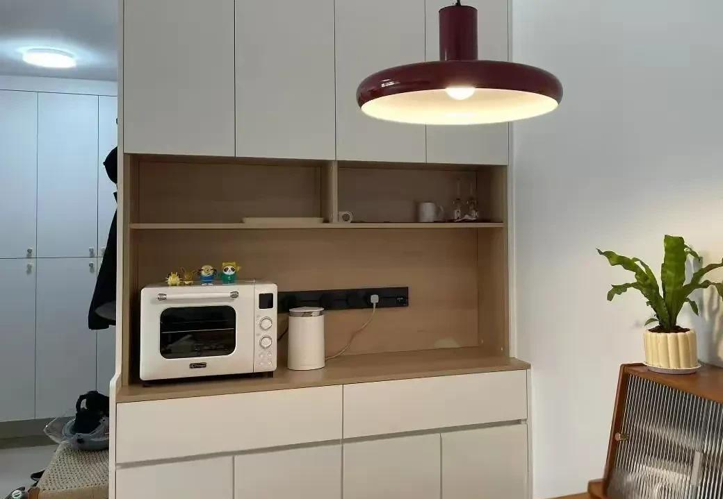 我朋友的餐边柜中间就安装了一个滑轨插座,原本以为很方便,实际使用中却发现,如果开放格深度较浅,就会导致小家电使用不便。