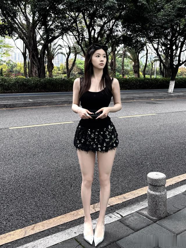 在这张细腻描绘都市生活一隅的照片中,年轻女性的身影仿佛成为了连接喧嚣与宁静的桥梁。她站在那里,不仅是空间上的一个点,更是时间轴上一个温馨而动人的瞬间。她的装扮,黑色无袖上衣与亮片短裙的巧妙结合,既体现了现代都市女性的独立与自信,又透露出一丝不易察觉的俏皮与灵动。