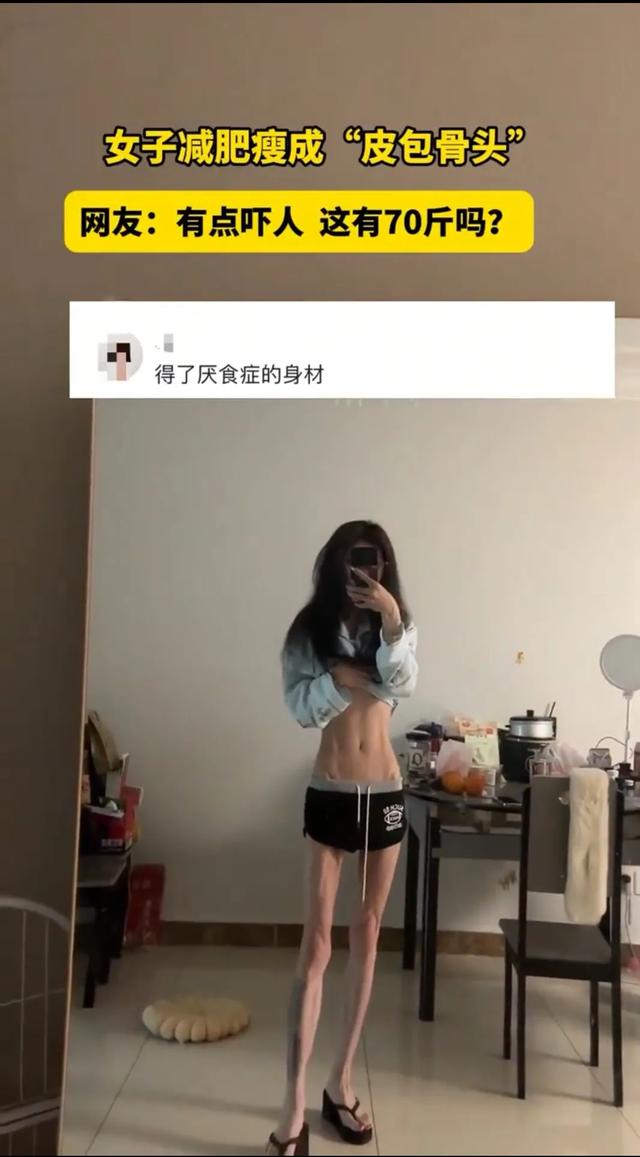 在社交媒体上流传的照片中,这名女子的身形显得异常消瘦,肋骨和脊椎骨清晰可见,仿佛只剩下了一层皮包裹着骨头,让人不禁感叹:“这瘦成了‘皮包骨头’了吧?”她的四肢纤细得如同竹竿,脸庞也消瘦得失去了往日的圆润,整个人的状态显得极为憔悴和虚弱。