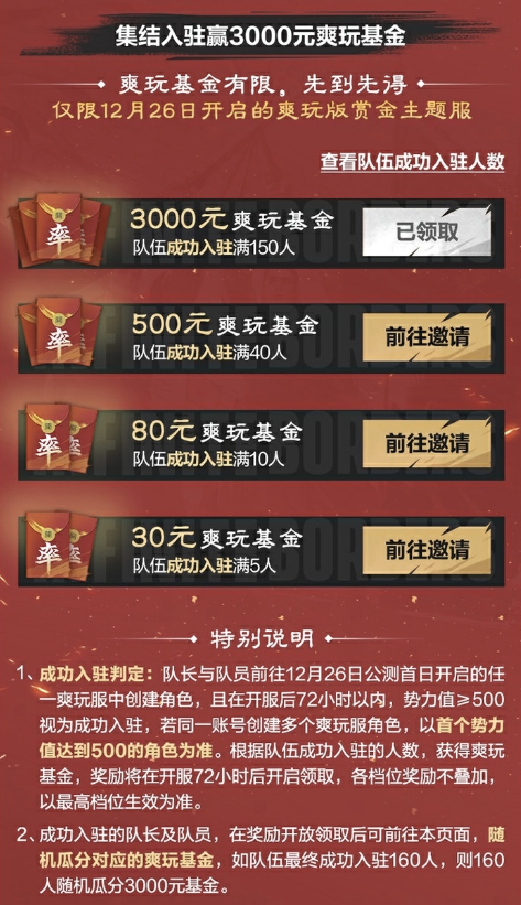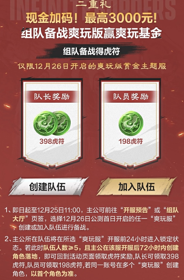 《率土之滨》爽玩服即将于12月26日全面公测,官方特意为摩拳擦掌的玩家们准备了现金池高达百万的集结活动,只要在25日锁定期开始前组建队伍,团长和团员均能再公测时获得虎符奖励,还能瓜分最高3000元的现金池!