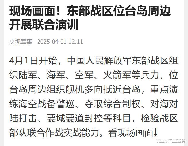 4月1日开始,中国人民解放军东部战区在台岛周边组织新一轮联合军事演习。参演单位除东部战区的对台一线部队外,还包括人民海军山东舰编队。