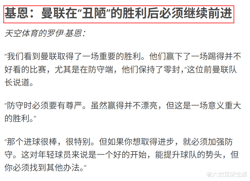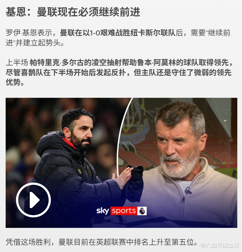 而阿莫林也承认到了比赛的尾声阶段他甚至采用了六后卫的阵型,这一点让基恩评价是“丑陋”的胜利。