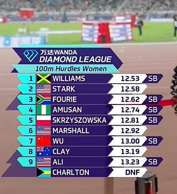 钻石联赛厦门站女子100米栏-吴艳妮13秒获第7,牙买加选手摘金