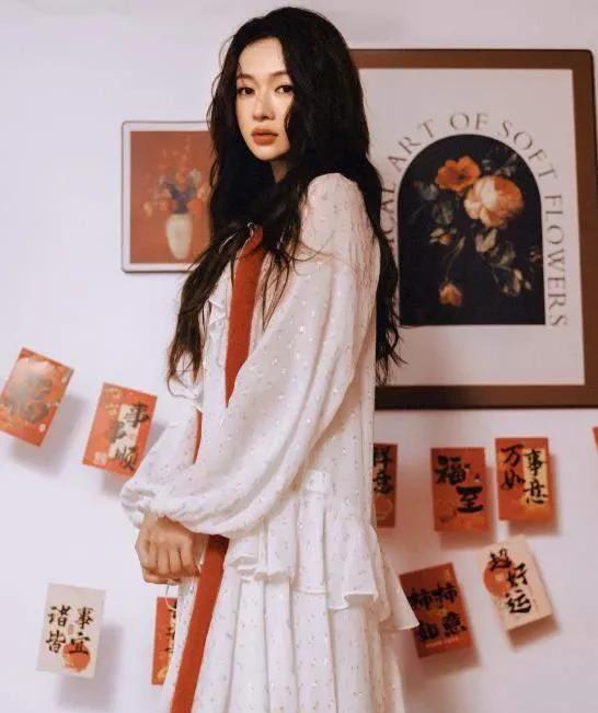 吴谨言穿着一件简单的白色连衣裙,头发随意地披在肩上,看起来特别清新自然。