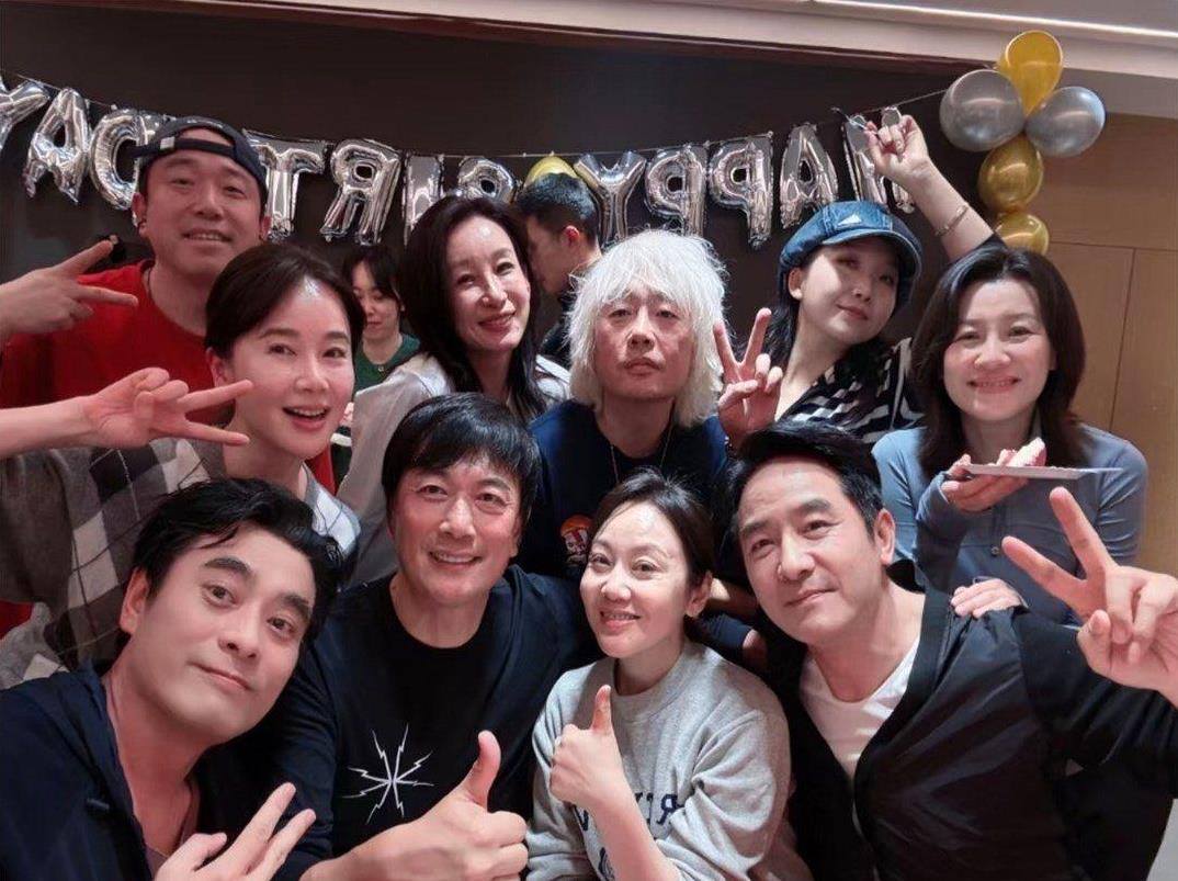 郭晓东则穿着白色的T恤搭配薄外套,一只手做“V”字形的手势。后排从左到右分别是潘斌龙、左小青、秦海璐、导演李非、李嘉琦和刘琳。潘斌龙戴着一顶帽子,穿着红色上衣;左小青穿着毛衣,并比出了剪刀手;秦海璐留着黑色长发,自然垂下,身穿白色上衣。导演李非的白色长发十分醒目。李嘉琦顶牛仔色的帽子,穿着黑白相间的上衣,并举起了手;刘琳穿着绿色上衣,一只手捧着蛋糕,另一只手搭在郭晓东的肩上,脸上带着笑容。