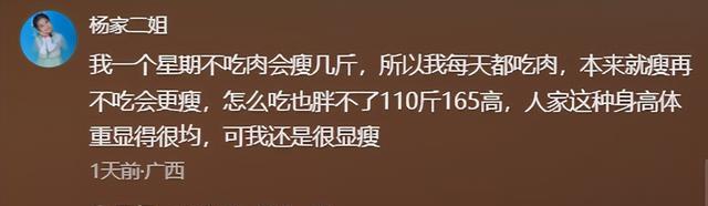 我一个星期不吃肉会瘦几斤,所以我每天都吃肉,本来就瘦再不吃会更瘦,怎么吃也胖不了110斤165高,人家这种身高体重显得很均,可我还是很显瘦。