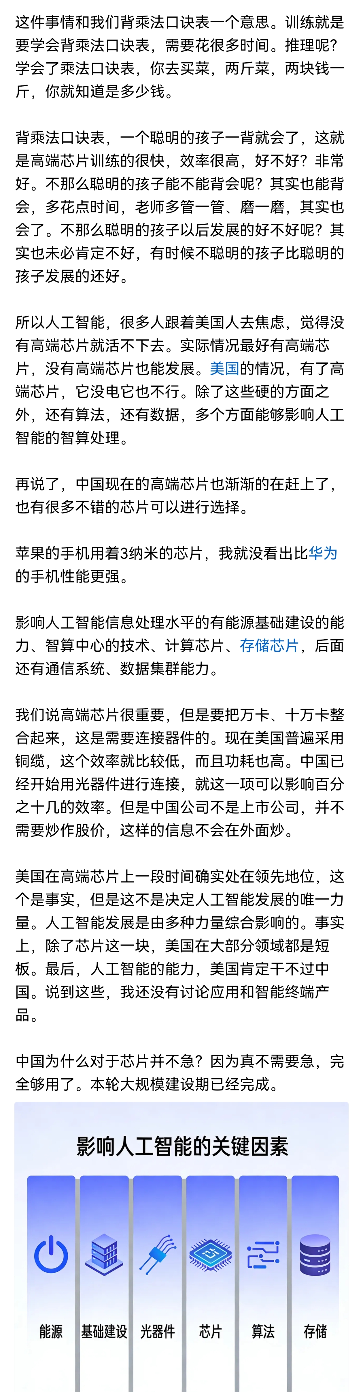 所以,拿芯片来说我们人工智能落后美国,无法实现超越引领,显然是片面的,不合理的。以当前的形势来看,不管是在硬件上,还是在能源供应、社会机制,乃至人才队伍上,优势都是在于我们。