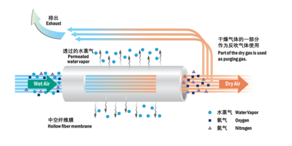 传统的脱湿方法是采用冷冻干燥机或分子筛吸附干燥机,而压缩空气膜法脱湿是近十几年来发展起来的新技术。当水蒸气通过中空纤维膜时,水分子的渗透速率较快,在压力差的作用下,水蒸气(H2O)渗透到渗透侧,其他气体空气中其他气体分子如O2、N2、CO2、He则留在渗余侧,并在压力的推动下到达出气口,从而达到脱湿、干燥的目的。
