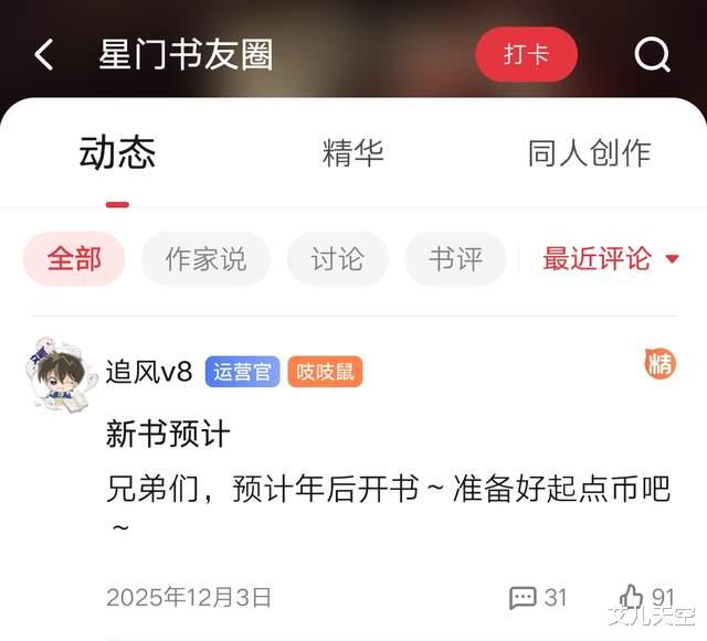 另外说到新书,提一下老鹰吃小鸡的情况,因为今天才看到之前追风在十二月初已经预告过老鹰要在年后开书了。