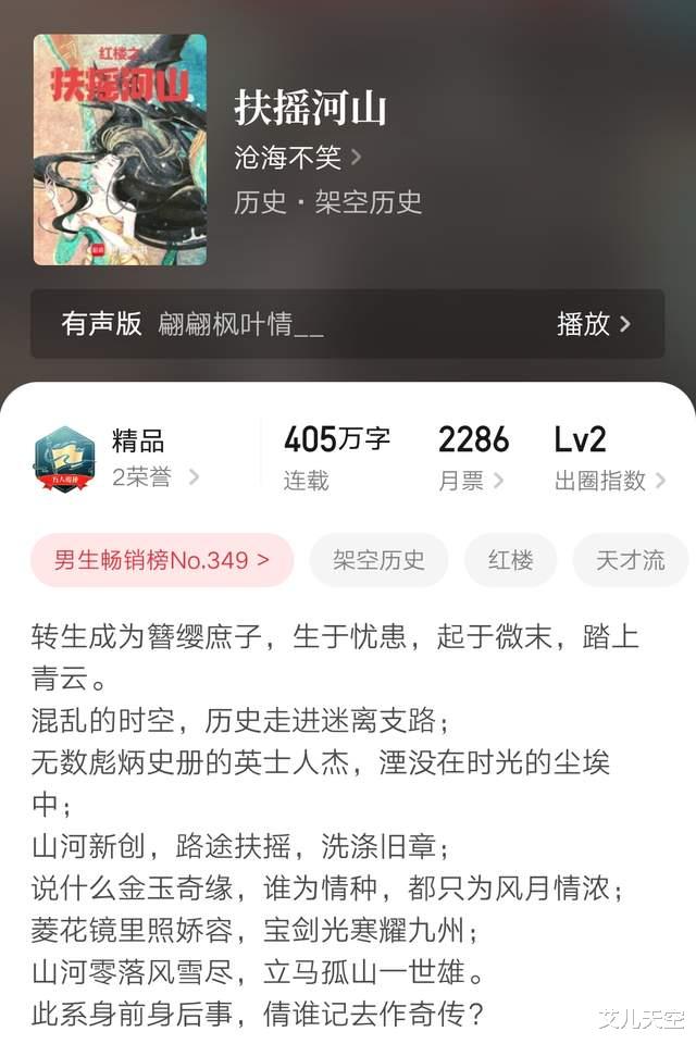 沧海不笑的这本红楼同人今天万订了,这个月第四本万订作品。小说原名是《红楼之扶摇河山》,去掉红楼之后辨识度感觉有点下降。