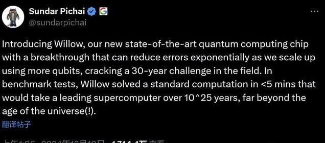 我们也可以从谷歌对这一研究的重视性上看出,这一次的科研成果的重要。因为在发布的时候是由谷歌CEO皮猜本人,亲自在社交媒体上进行公布。