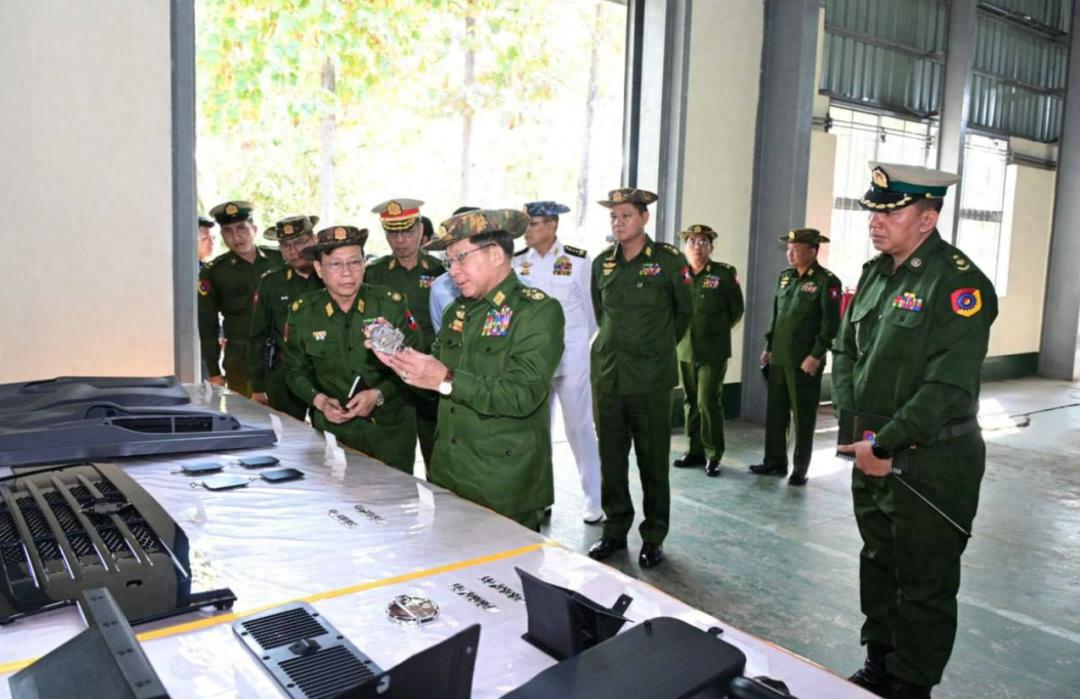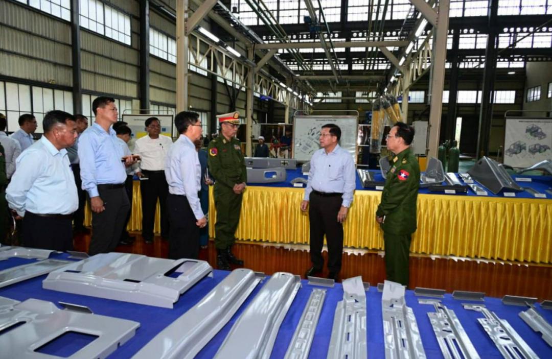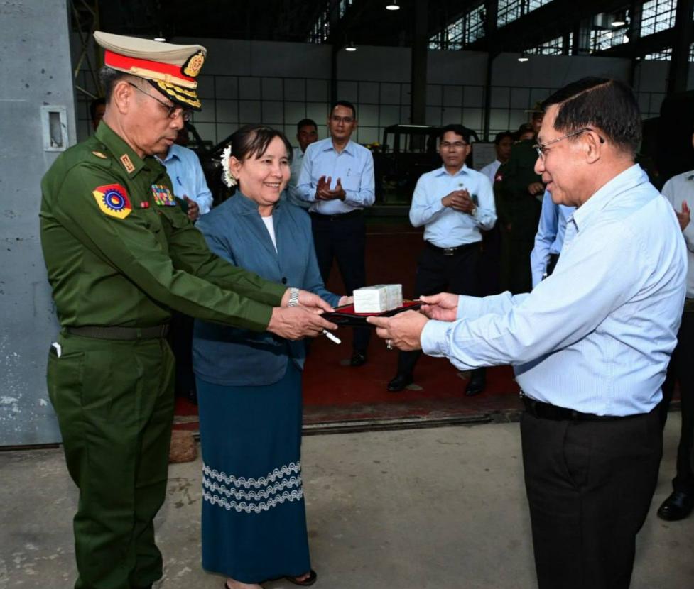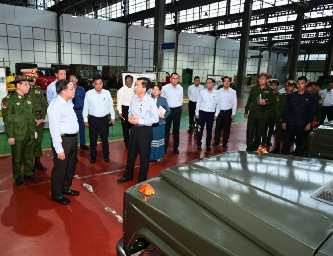 1月8日,缅甸代总统、国家安全与和平稳定委员会主席、国防军总司令敏昂莱大将,前往勃固省欣德和通博地区的国防军大型本土工厂视察了农用机械和机动车辆的生产情况。