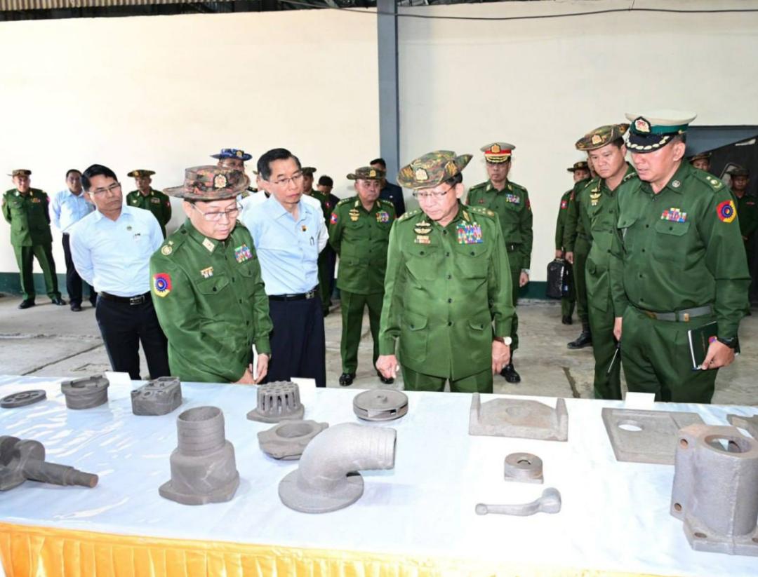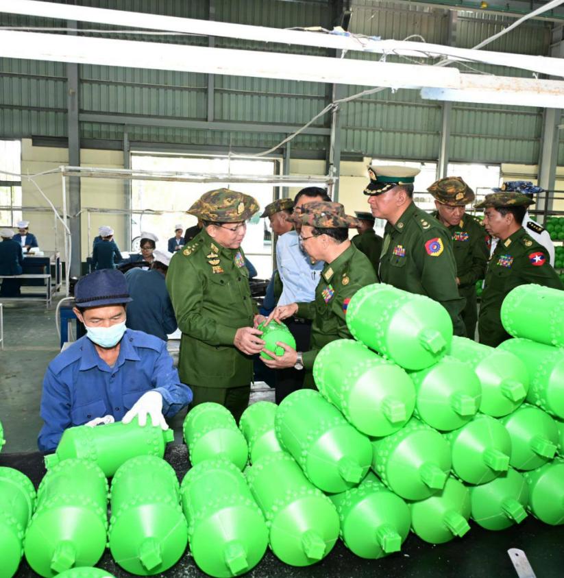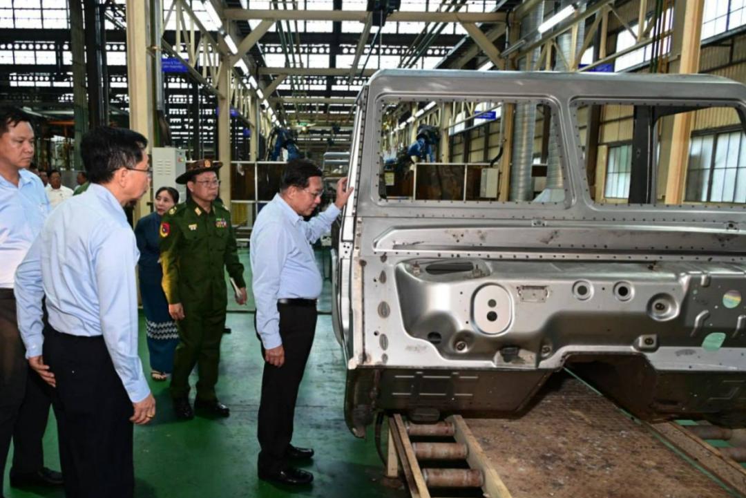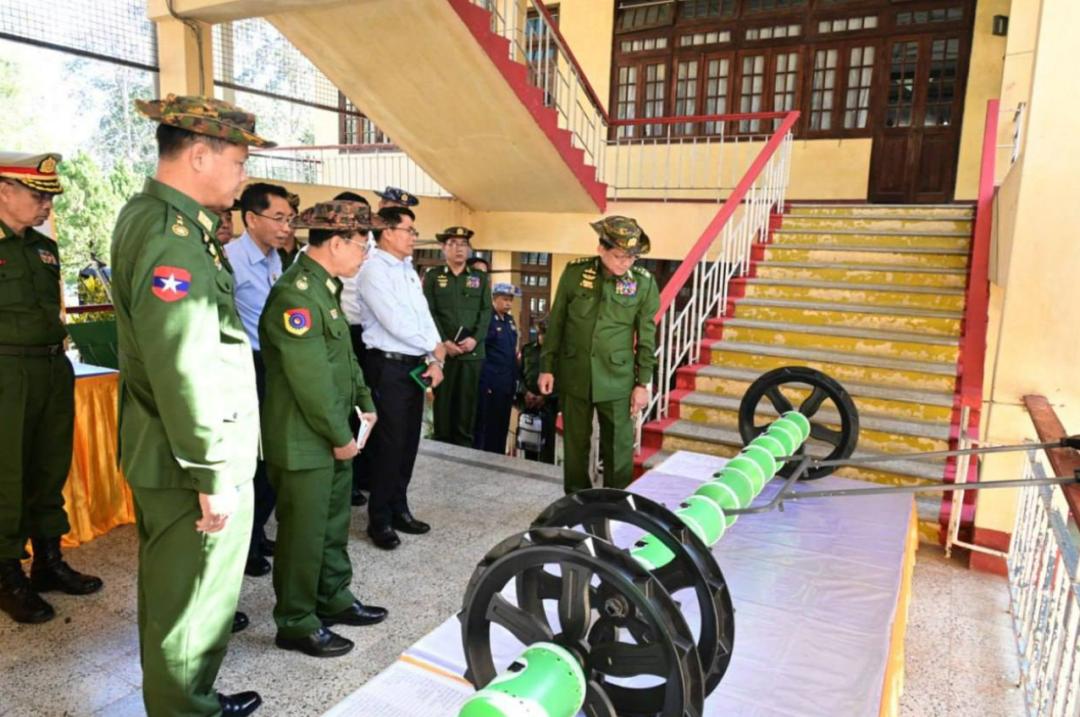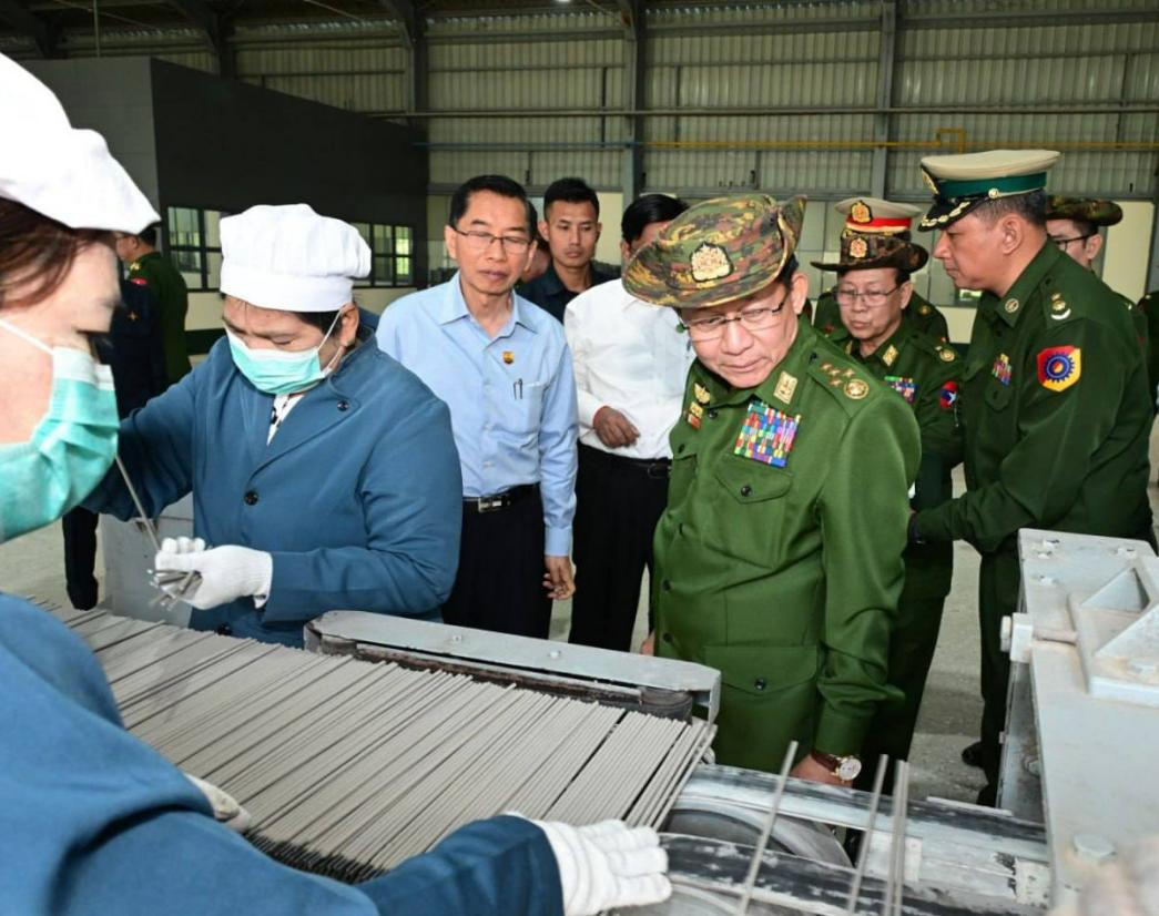 1月8日,缅甸代总统、国家安全与和平稳定委员会主席、国防军总司令敏昂莱大将,前往勃固省欣德和通博地区的国防军大型本土工厂视察了农用机械和机动车辆的生产情况。