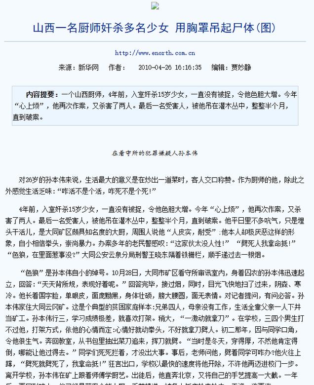 参考资料:《山西一名厨师奸杀多名少女 用胸罩吊起尸体》,贾妙静