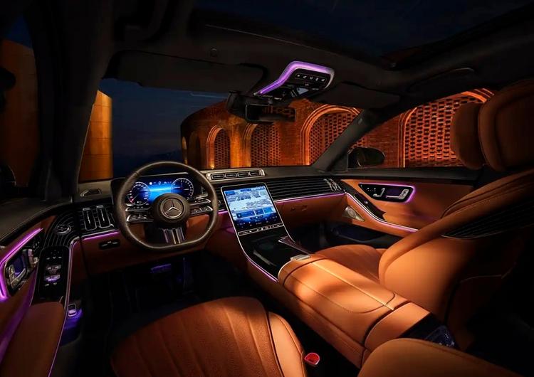 内饰方面,新车全系标配的动态星徽迎宾灯,以璀璨的星徽光毯迎接乘客,营造出强烈的仪式感。车内搭载的Burmester®高端4D环绕立体声音响系统,配备31个扬声器和8个座椅振荡器。此外,车内还配备了7英寸MBUX后排智能平板电脑、双11.6英寸后排娱乐系统、12.3英寸裸眼3D数字仪表屏和12.8英寸OLED中央显示屏,能够实现六屏交互。