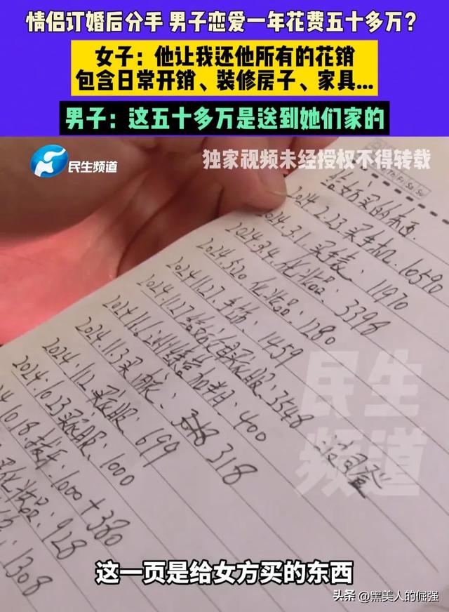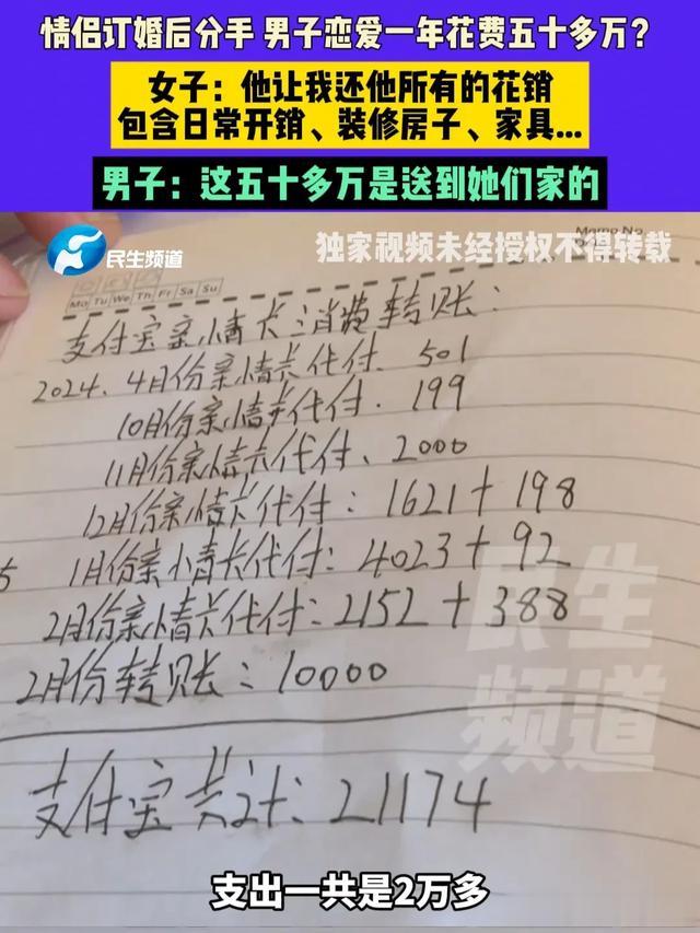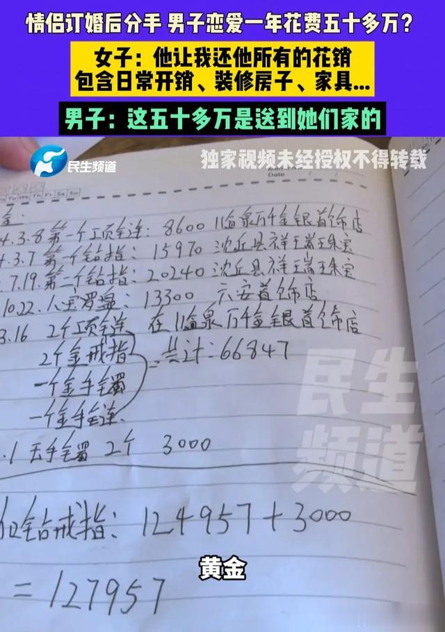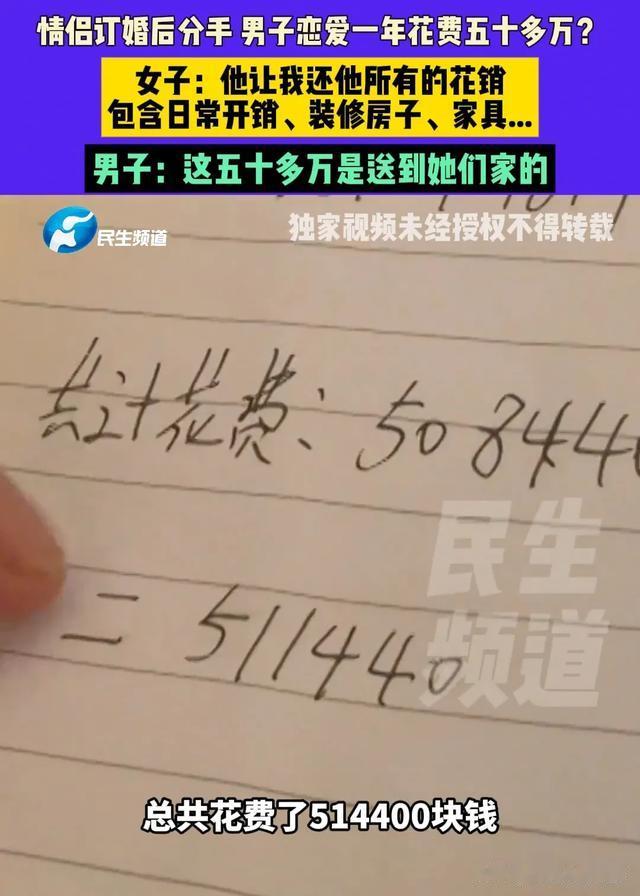 眼看这到手的媳妇飞走了,王先生也无力再挽回这段感情,可谈了这一年的恋爱,王先生可是付出了高额的费用的,杂七杂八地算下来竟然花了五十多万,既然两人分手了,王先生认为李女士应该把这五十多万的花销还给他。