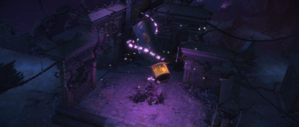 地府的场景塑造同样特色十足!阴森、破败的诡谲感油然而生,既保留了中式建筑的骨架,又用暗色调、邪异光效渲染出惊悚诡异的氛围,与天宫的清朗形成了鲜明的对比。