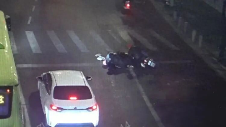 画面中,红帽男子脚步缓慢,却一点点远离伤者。接着,他开始推车——他要走了。庞女士察觉不对,赶紧举起手机,拍下了他的车牌。随后,男子骑上车,闯红灯驶过斑马线,消失在夜色中。