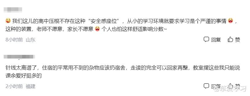 这个精致座位也让山河四省学子齐破防,众所周知这四个省份高考竞争非常激烈,稍微松懈一点可能没好大学上,每天学习都学不完,哪还有精力去布置课桌?把座位弄得如此舒服,肯定会分散学习的注意力,最后勉强上个大专的水平。