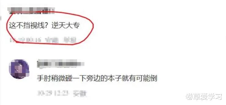 当然也有人从实用性方面来质疑,首先这名学生把书都竖起来摆在正前方,势必会遮挡视线的,而且看得出来课桌并不大,摆放的东西占了很多,留给学生看书写字的地方就很小了。