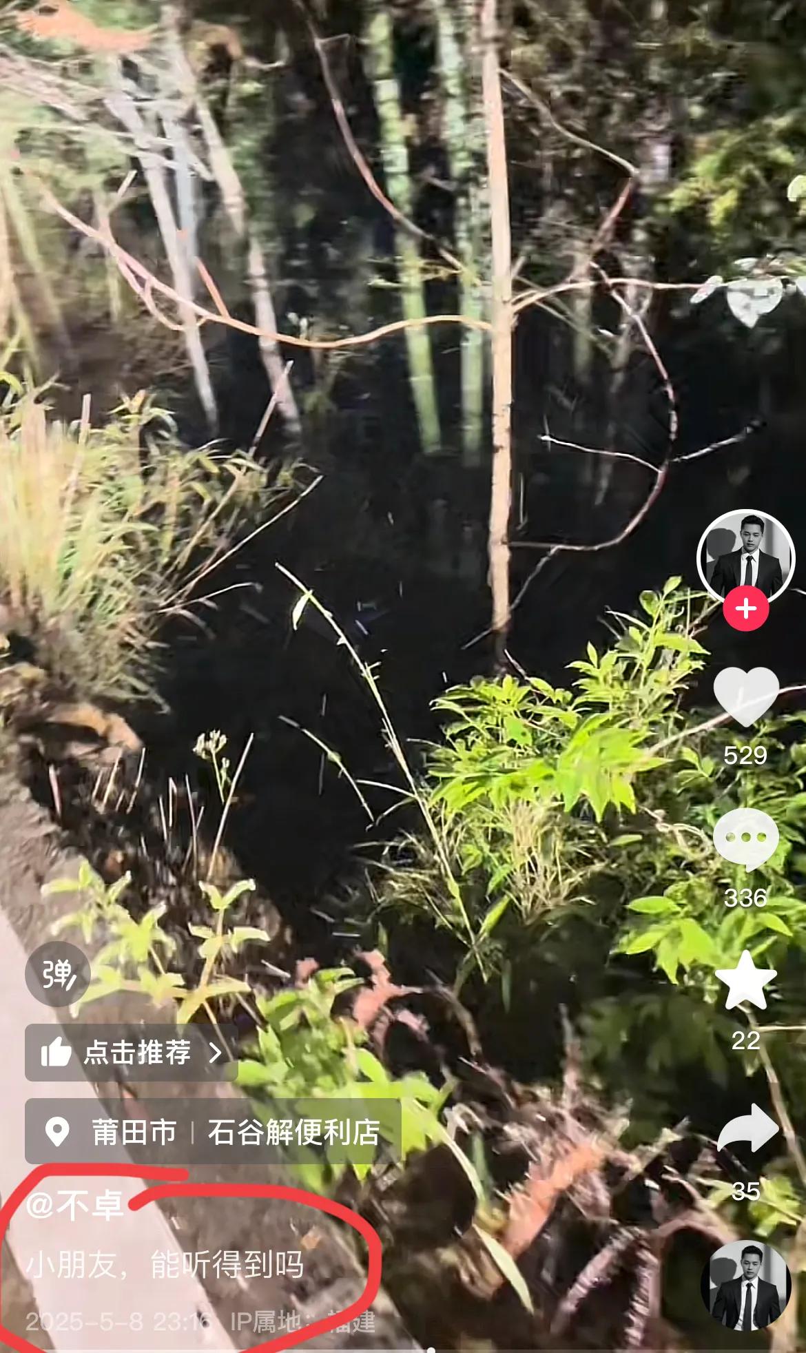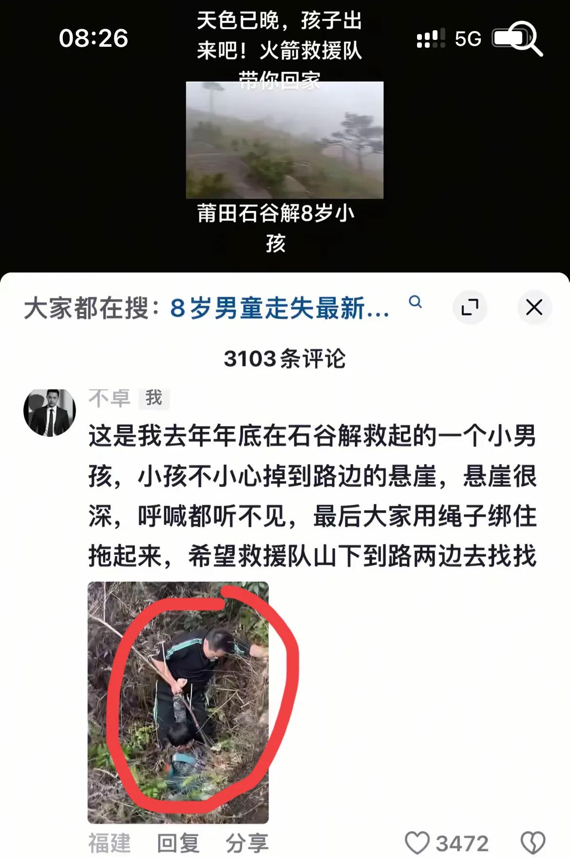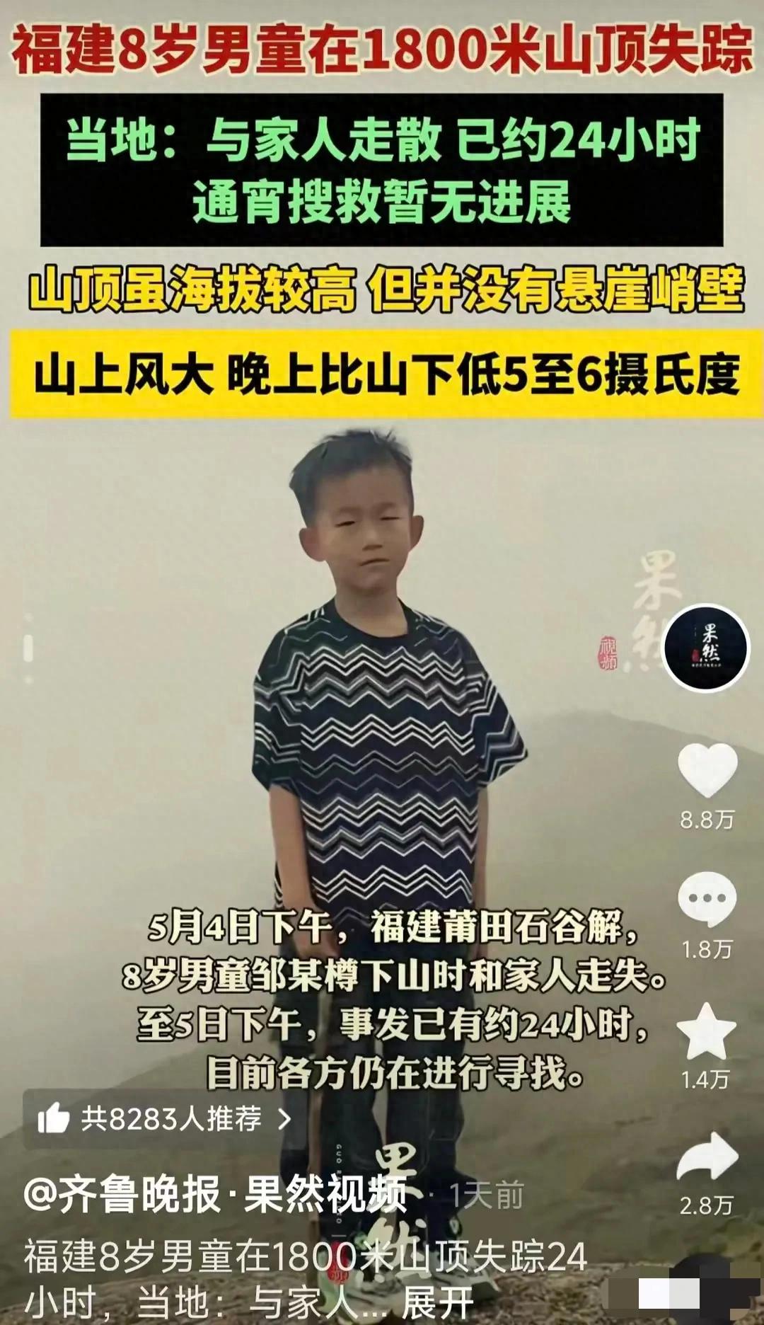 5月4日,8岁男童邹煜樽在福建莆田石谷解与家人走失。