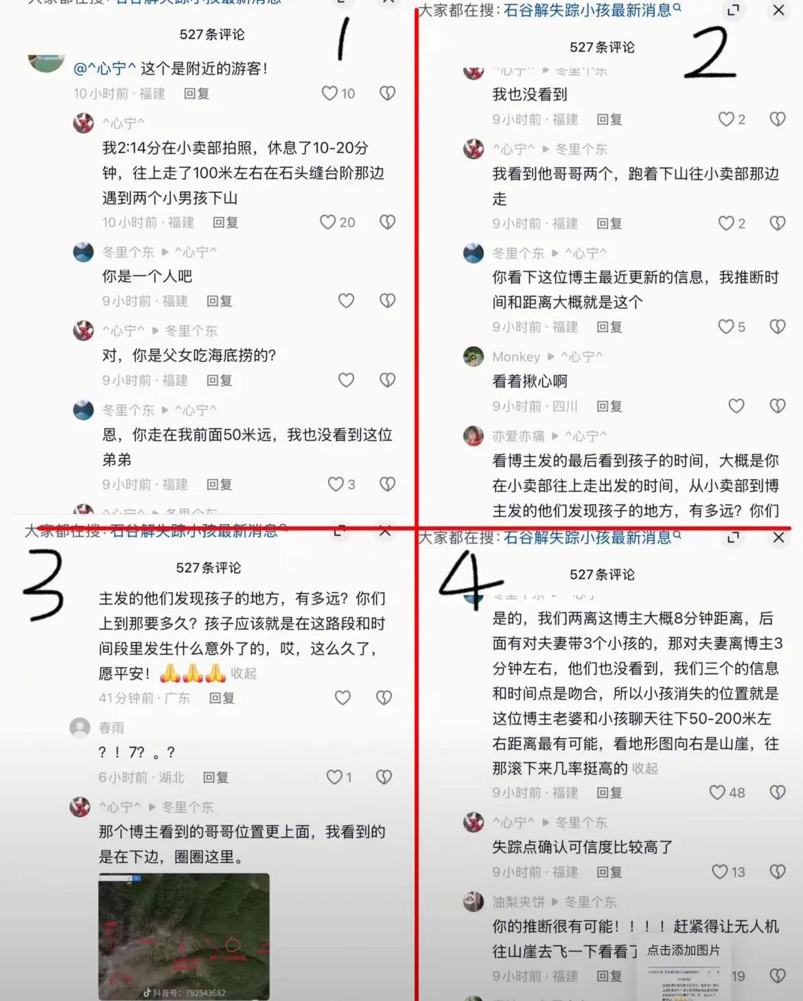 由于孩子走失时是5.1假期,石谷解的游客还是挺多的,所以当寻人启事发出后,有很多好心人也主动提供了不少线索。