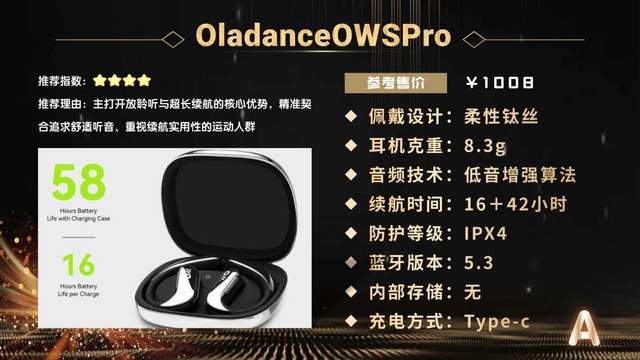 OladanceOWSPro凭借不入耳开放结构,主打开放式聆听与超长续航,适合追求舒适佩戴、重视续航表现的运动人群。