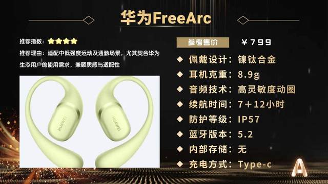 华为FreeArc是品牌首款开放式耳挂耳机,以强劲低频与舒适佩戴为核心亮点,适配中低强度运动与通勤,尤其适合华为生态用户。
