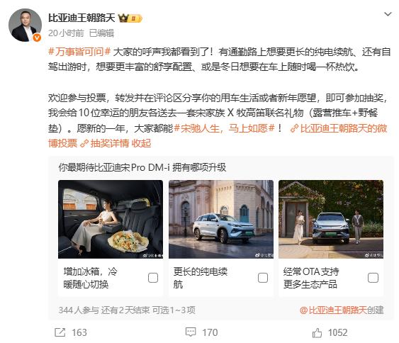 昨天,比亚迪王朝网的销售事业部总经理路天在微博上发起了一项关于宋Pro DM-i的投票,问大家最期待它拥有哪项升级。结果一点都不意外,“更长的纯电续航”以压倒性的优势成为用户最大的呼声。这就像在平静的湖面上投下了一颗石子,让很多像我这样的潜在买家心里泛起了涟漪。