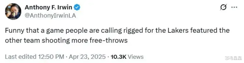 他直言不讳地表示:“真有意思,一场被人们说成是偏袒湖人的比赛,结果却是另一支球队获得了更多的罚球机会。”这种观点的抛出无疑引发了众多球迷的深思。要知道,在如今这个信息传播极为迅速的时代,任何一场比赛的判罚都可能被置于放大镜下,被无数双眼睛审视和评判。