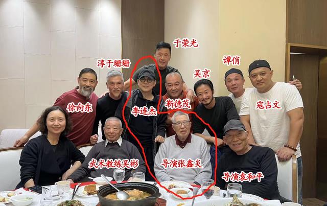 最吸引人目光的无疑是第二排站着的吴京、李连杰和于荣光这三位武打明星,他们几乎代表了整个华语武打电影的一个时代。
