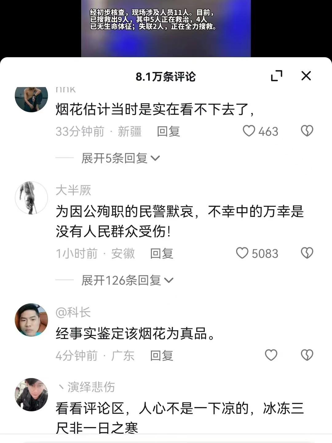 派出所爆炸大事件发生后,在网上被网友们所关注的时候,视频的评论大部分是一些冷嘲热讽令人心寒的声音言语,不但没有关心关注到警察的受伤牺牲而感到敬佩,而是质疑怀疑他们凭什么为什么有这个权利去使用烟花和鉴定烟花,更重要的是去鉴定烟花总共去了11名警察,质疑他们是去鉴定还是去分赃了。