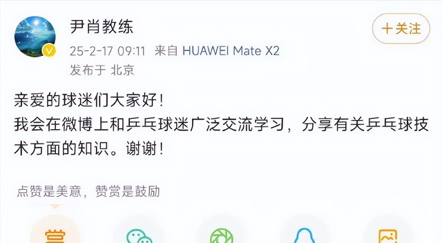 并表示自己的微博账号将来将会用来和大家分享乒乓球技术。
