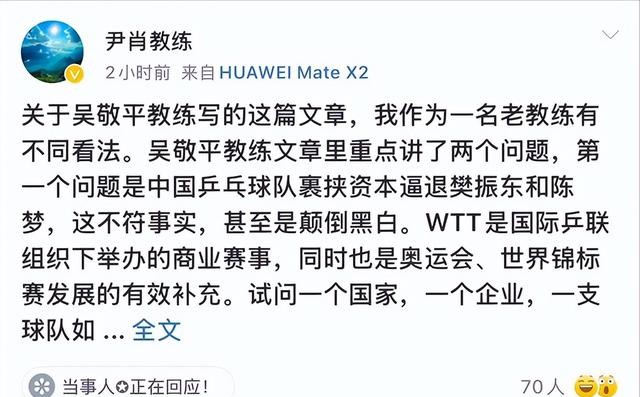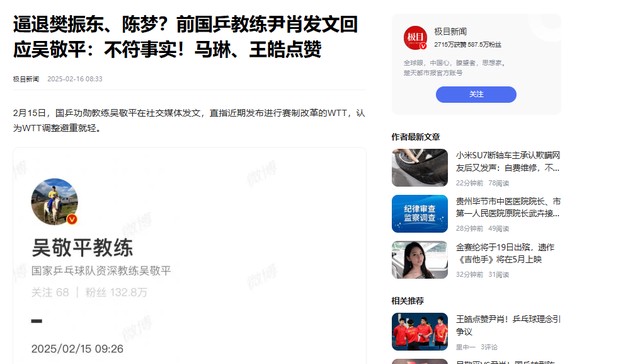 逼退樊振东、陈梦?前国乒教练尹肖发文回应吴敬平:不符事实!马琳、王皓点赞.极目新闻.2025-02-16