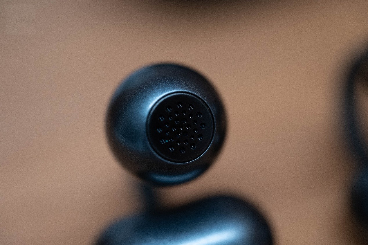 我手上这款是“学院灰”配色,实物看起来十分有质感。耳机表面做了特殊处理,有一种细腻的触感和质感。最吸睛的是耳机外侧那一圈细细的金属环,官方叫“星环圈”,设计感一下子就上来了,让这个小球体显得不那么单调。