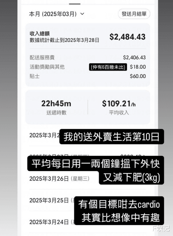 不过最近王东泰就突然在社交网站晒出自己兼职当外卖员,他透露每天平均用1、2个小时送外卖,送外卖10天就有2000多港元的收入,他觉得送外卖就当去健身锻炼一样。