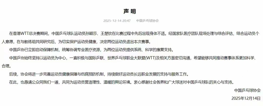 【新华社】中国乒协回应WTT总决赛孙颖莎、王楚钦退赛