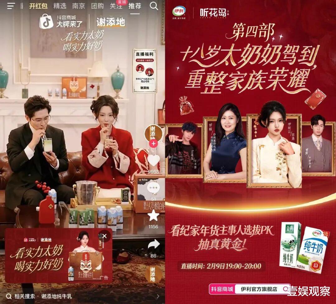 与此同时,短剧IP走进直播间也让品牌链路转化更为顺畅。抖音商城大牌来了就邀请《十八岁太奶奶4》主演李柯以和赵廷义做客直播间,为牛奶谢添地带货。二人在现场以谢添地产品分享起了牛奶饮品的做法,同样地,主演们也做客上述提到的合作品牌直播间,实现了从内容到营销的站内资源打通;而李柯以、王培延、曾辉还空降了伊利抖音直播间,畅聊幕后故事,还有抽黄金的互动……