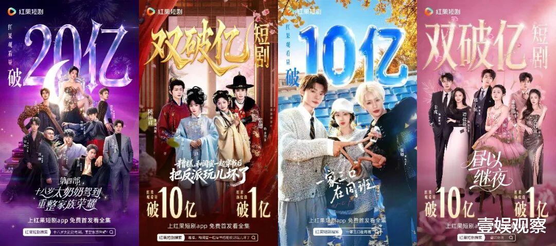 一方面,红果们在站内短剧分区给到“爆”字标签越来越高频,另一方面,破亿战报批量式送达,营造平台的“热闹非凡”,如《十八岁太奶奶驾到,重整家族荣耀4》《糟糕,和闺蜜一起穿书后把反派玩儿坏了》《一家三口在同班》《昼以继夜》《穿书富家妯娌,我和闺蜜齐上阵2》等红果短剧双破亿海报眼花缭乱,其中《十八岁太奶奶4》更是拿下了10天播放量破20亿的春节档短剧最佳战绩,比第三部破20亿速度加快一周时间。