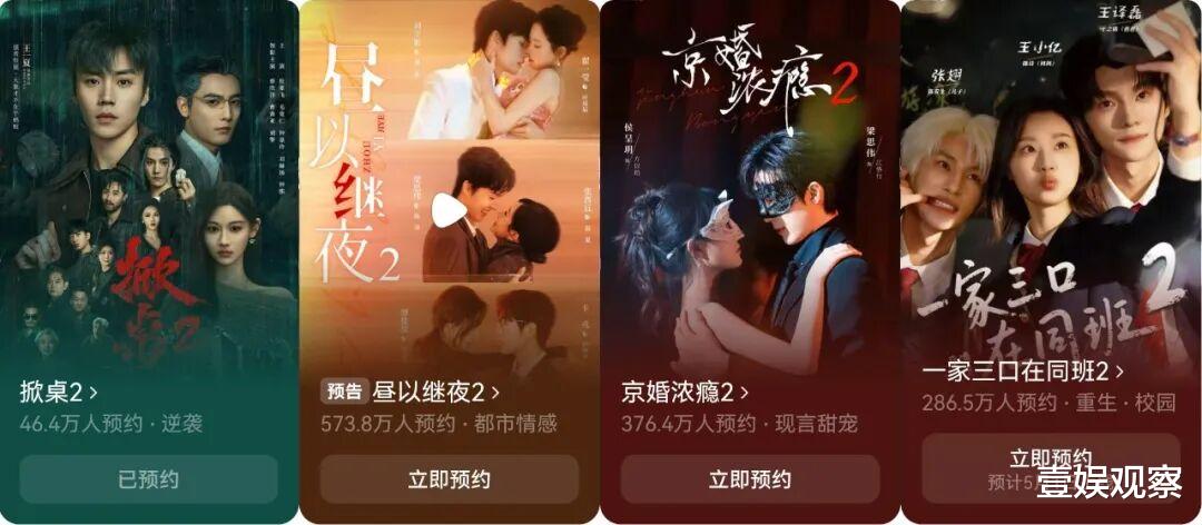 相比春节档里成熟IP趁热推出新内容占坑,市场更能看到多部春节档的热门内容第一部就直接给下一部设置“引子”,将IP系列化野心完全前置体现。春节档上线的新剧《掀桌》《昼以继夜》《京婚浓瘾》《一家三口在同班》《糟糕,和闺蜜一起穿书后把反派玩儿坏了》等剧都有第二部计划,且看完剧也不难发现,而《一品布衣4》《太奶奶5》等剧在前作一播完就引来不少人早早预约。