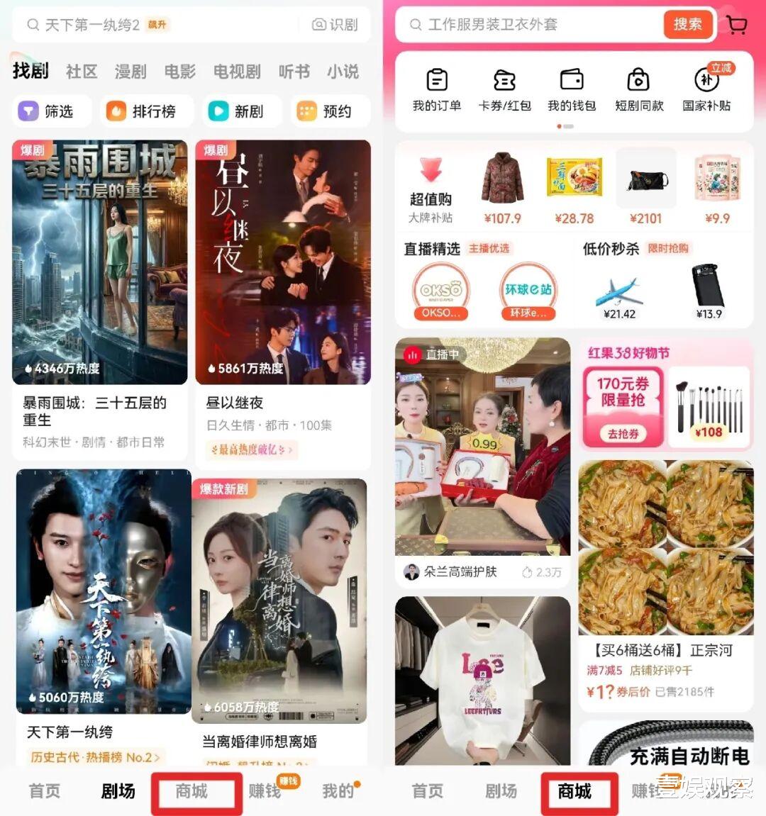 与此同时,红果短剧的电商链路也在打开。相较于之前所提及的“搜同款”设置增强短剧的电商转化效果之外,这一次,红果直接在APP首页底部的选项栏里直接出现了“商城”的选项,意图让短剧带货走向更加顺畅的场景。