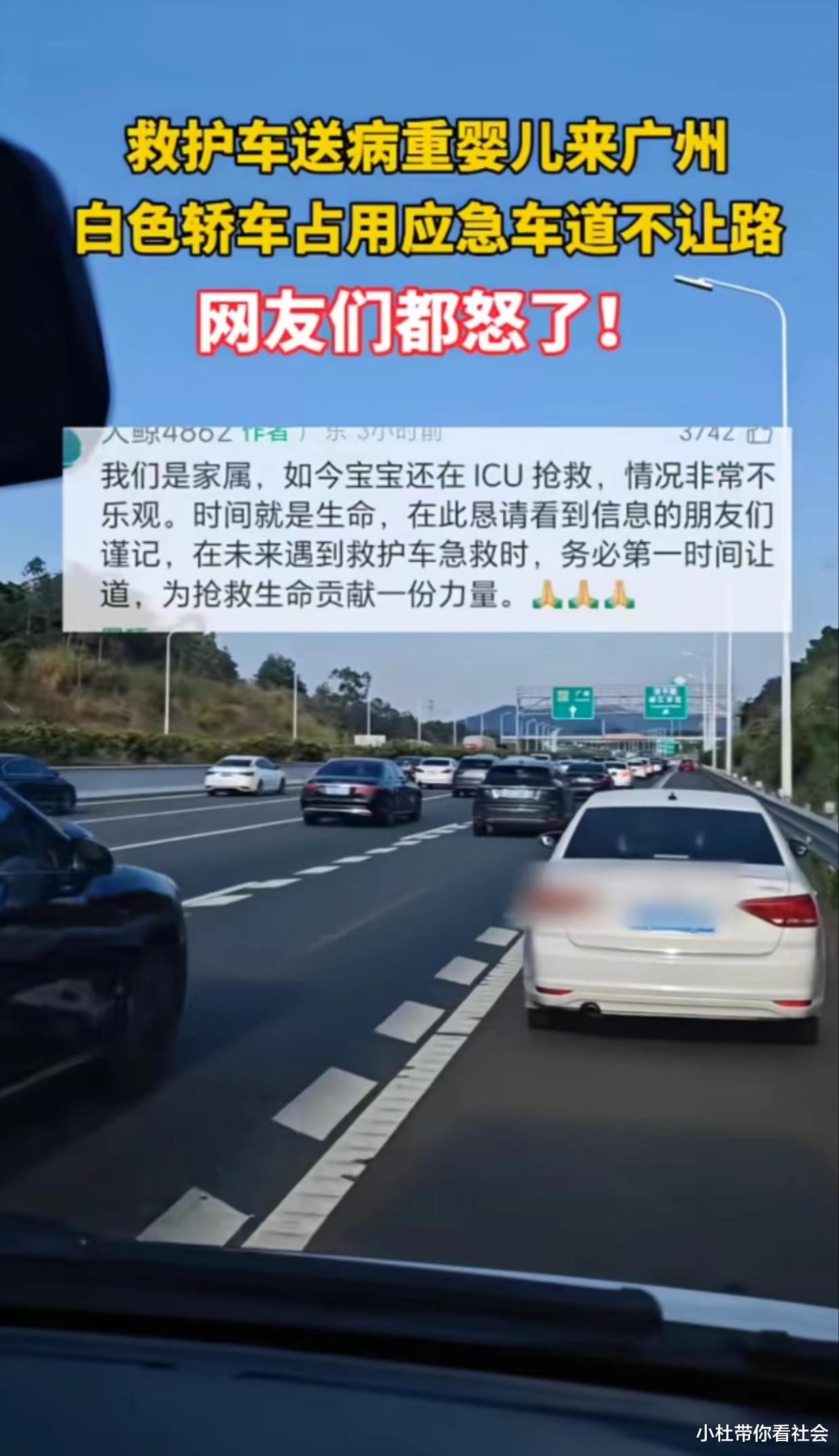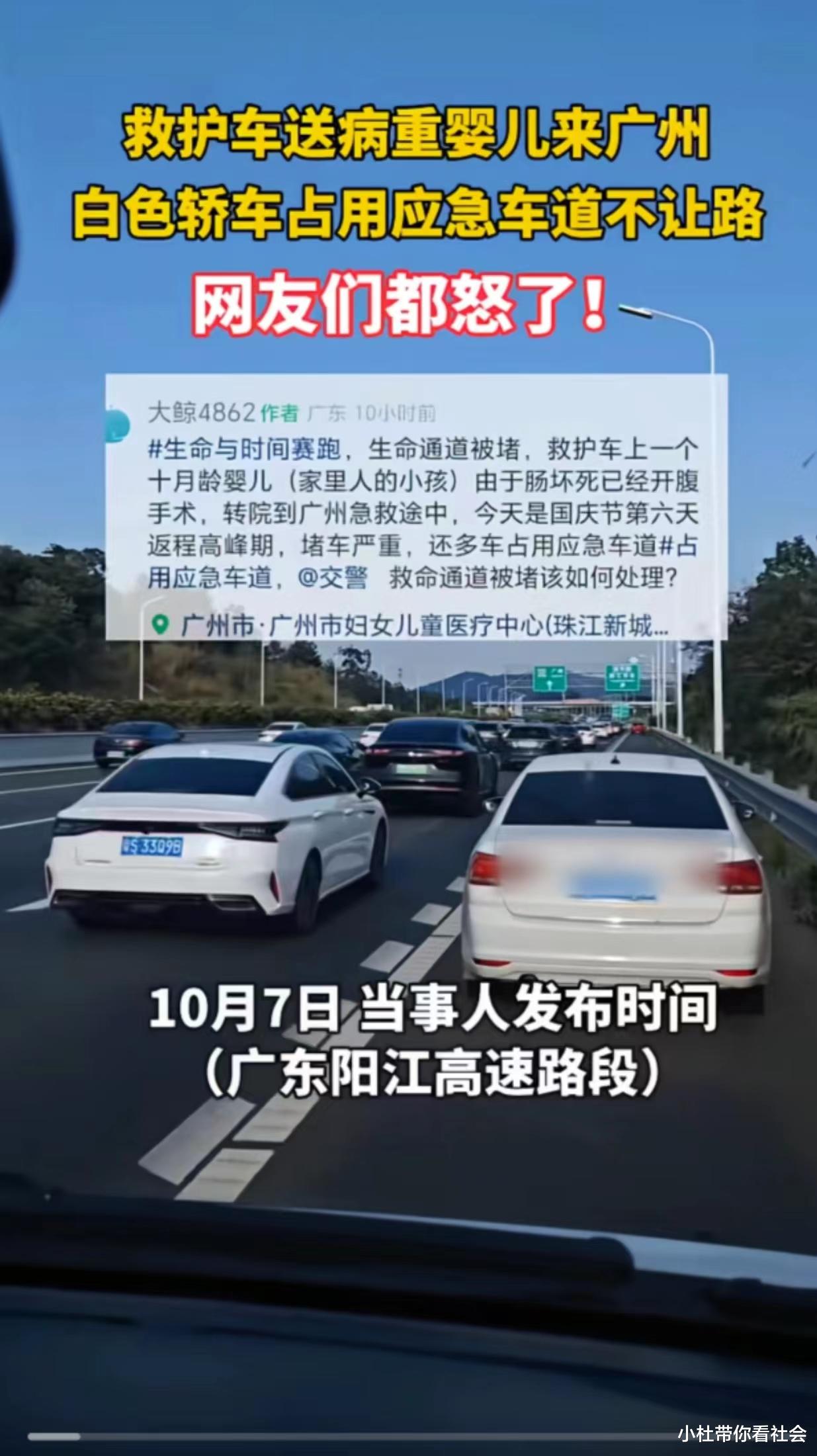 10月7日,一辆载着10个多月大的病重婴儿(因为肠坏死需要做手术)的救护车,在转院到广州的途中,遭遇白色轿车占用应急车道并且不让道。救护车的警报声在阳江高速上空回荡,但那辆白色轿车却像是被固定在了路上,无论救护车如何鸣笛示意,它都无动于衷。当救护车司机以为轿车司机听不到时,他们发现轿车的车窗是开着的,这就更让人气愤了。救护车司机焦急万分,他试图通过各种方式提醒轿车让路,但一切努力似乎都付诸东流。最后也是将婴儿送到了医院,家属发文称宝宝正在ICU里抢救,情况非常不乐观。轿车司机的心怎会如此冰冷,真的很难想象如果是轿车司机的孩子遇到这种情况他会怎么处理?