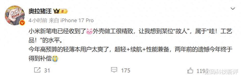 他还暗示,这一代小米笔记本电脑新品将采用 Panther Lake 处理器,定位较高,可兼顾重量 + 续航 + 性能三大领域,只是售价可能不会很便宜。